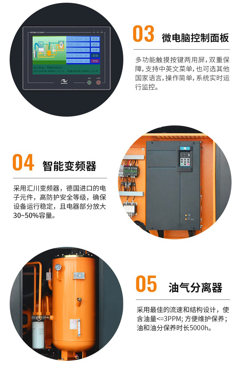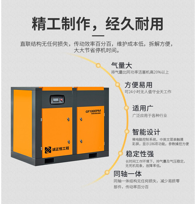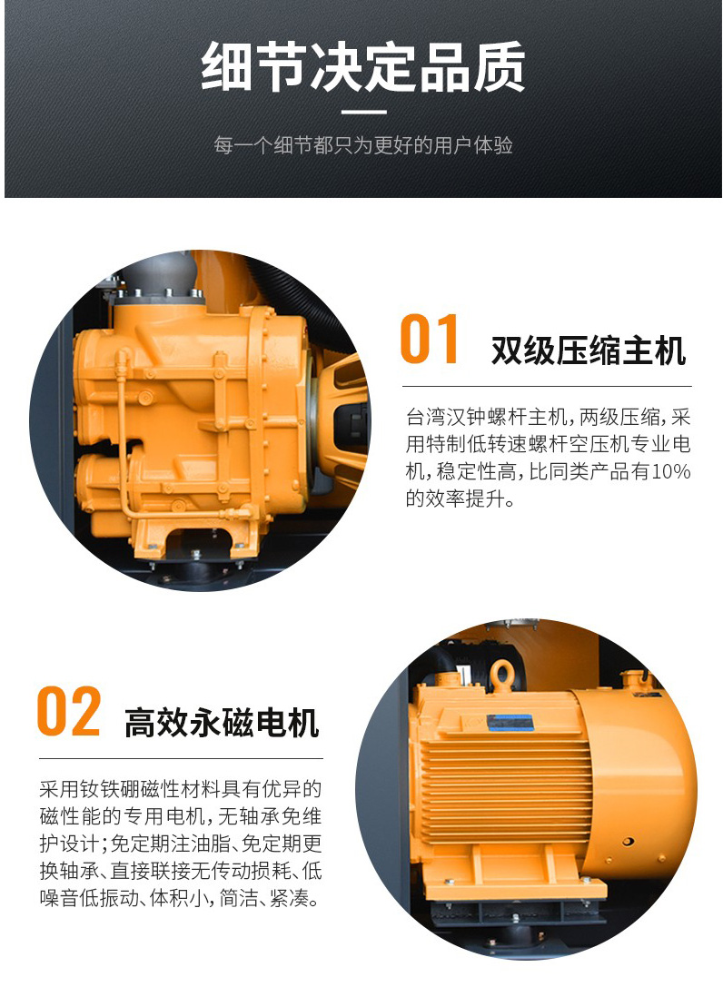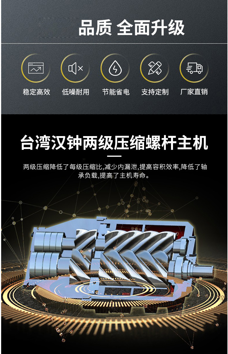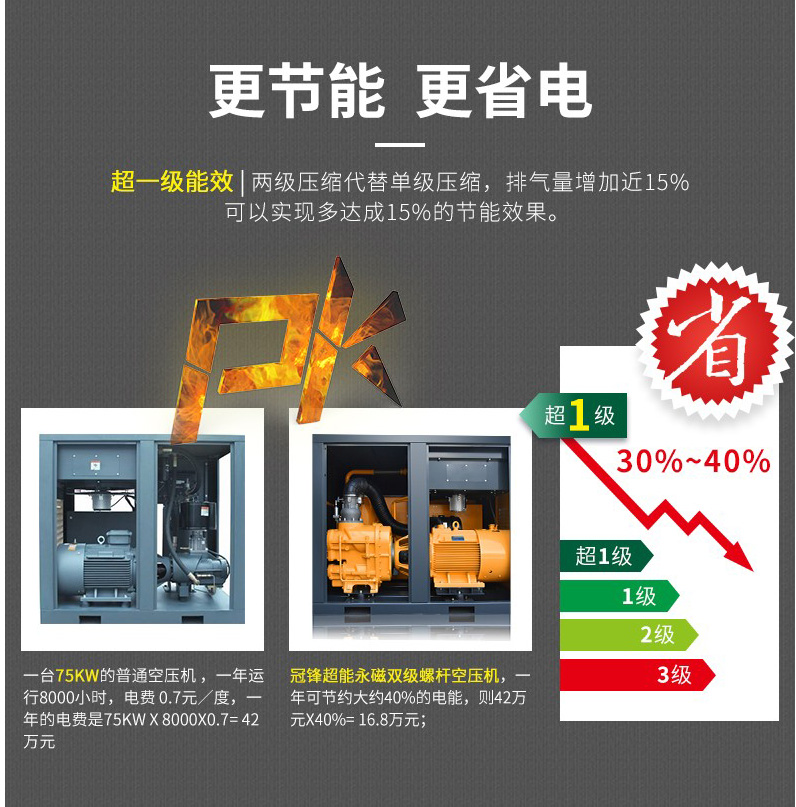 雙級(jí)壓縮主機(jī)更高效、更節(jié)能較雙螺桿空壓機(jī)節(jié)能高達(dá)35%以8000h/臺(tái)/年計(jì)算,每年可節(jié)約20萬(wàn)元電費(fèi)。
